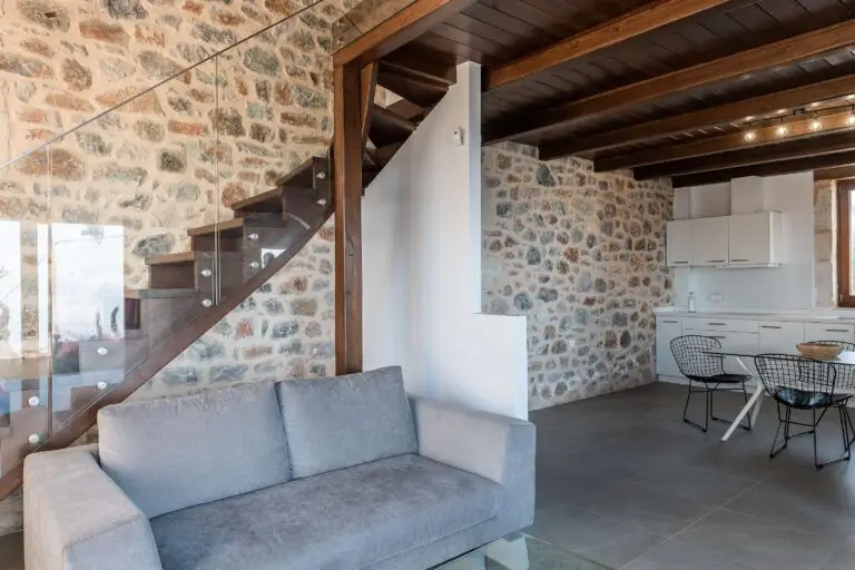 Notre villa en pierres, typique de la Crête, est conçue sur deux niveaux. Au RDC : cuisine, salon et SDB (40m2)